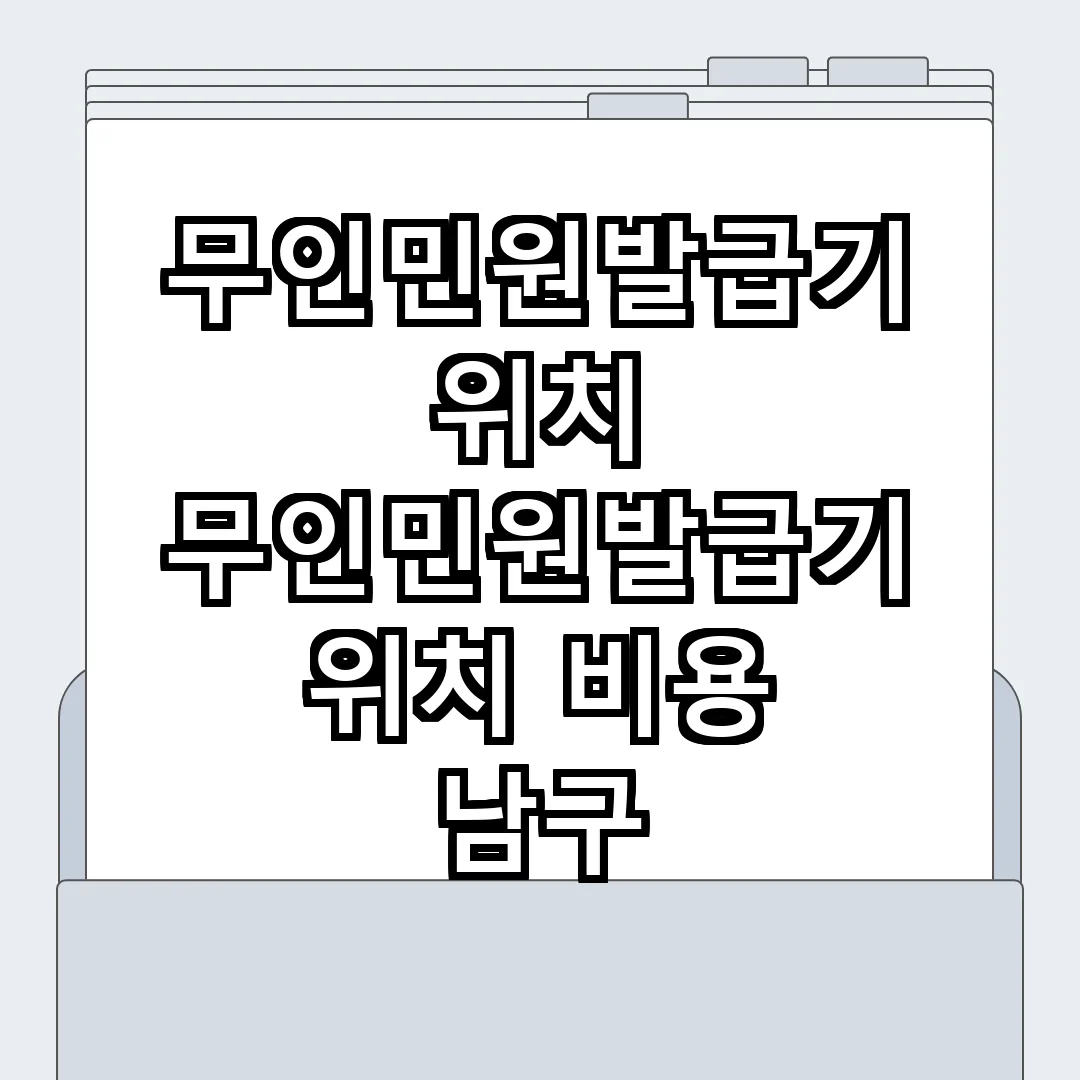 남구에서는 무인민원발급기가 다양한 공공장소에 설치되어 있어 주민들이 편리하게 이용할 수 있습니다. 특히, 주민센터, 대형마트, 도서관 등 사람들이 많이 방문하는 장소에 위치해 있어 접근성이 좋습니다. 각 발급기는 주민등록등본, 가족관계증명서 등의 서류를 발급할 수 있으니 미리 위치를 확인하고 방문하는 것이 좋습니다.